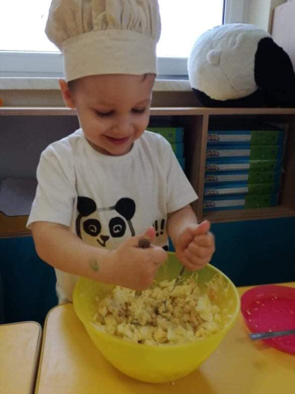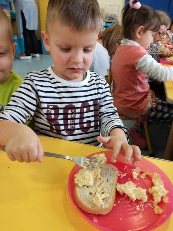 W dniu dzisiejszym Słowiki I i II na kuchcikowie zrobiły pastę jajeczną. Zadaniem dzieci było obrać ugotowane jajka, rozdrobić je, doprawić i wymieszać. Przygotowane własnoręcznie kanapeczki zajadali ze smakiem.