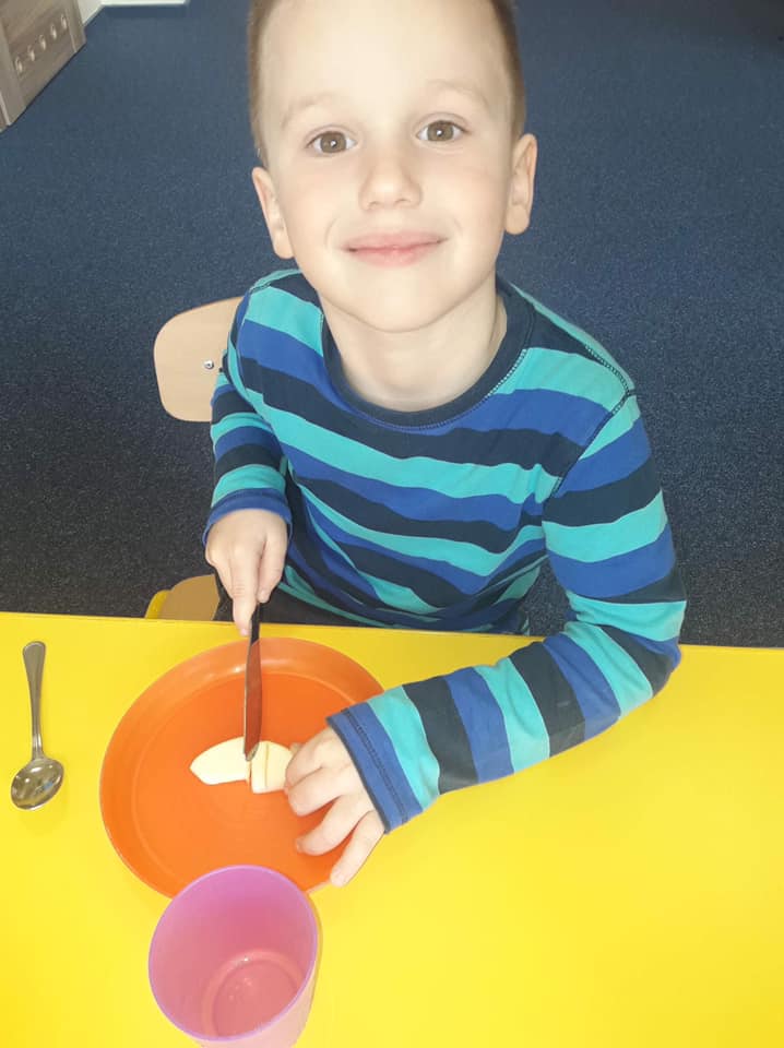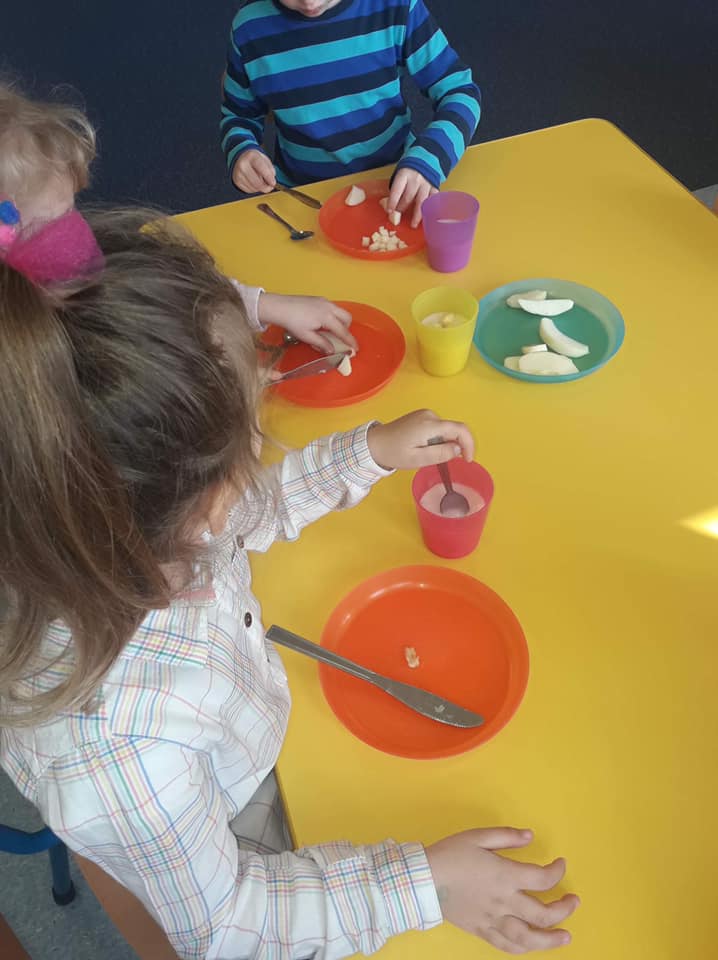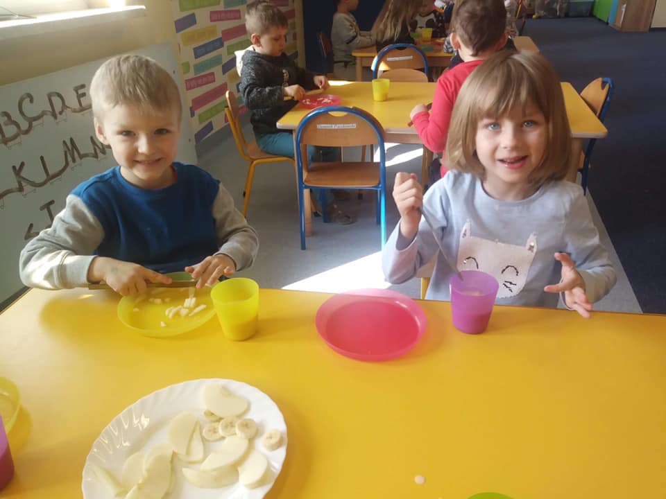 Na dzisiejszych zajęciach z kuchcikowa grupa Sowy 1 i Sowy 2 przygotowała sobie pyszny deser: jogurt z owocami. Celem zajęć było kształtowanie zdrowych nawyków żywieniowych